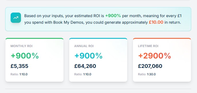 Input your sales data to visualise the growth bookmydemos.com can drive for your business against any DFY package, based on average returns experienced by our clients in the last 6 months.